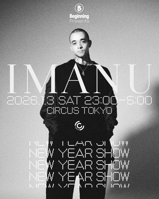 ドラムンベースをルーツに持ちながら Breaks, House, Future-leaning soundsなどジャンルにとらわれず感情・テクスチャ・サウンドの質感を重視してリリースを重ねるIMANUが2026年、Beginningの新年最初のショーに登場!!ジャンルを自在に横断するIMANUのライブは感情豊かなサウンドデザインと躍動するリズムで観客を魅了するだろう!